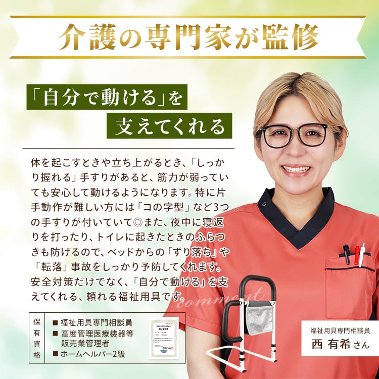 おうちのベッドが、もっと「安心」できる場所に。体を支える頑丈な設計で、立ち上がるときのふらつきを軽減。転倒のリスクを減らし、安心してお使いいただけます。