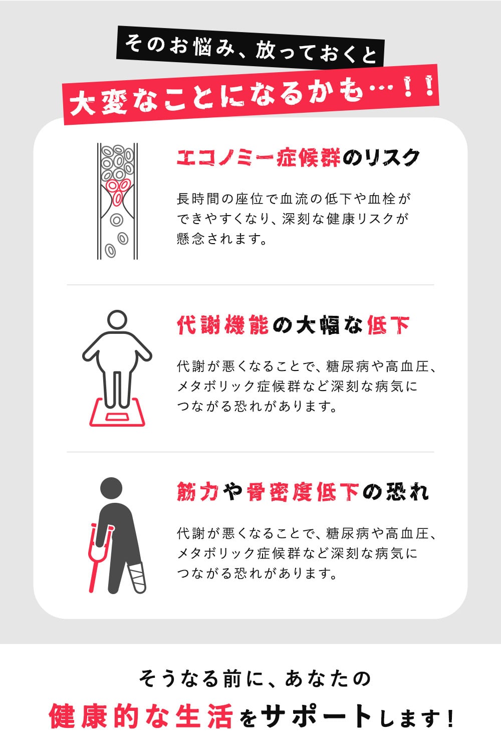 放置すると、血流低下や筋力低下、生活習慣病のリスクまで高まります。