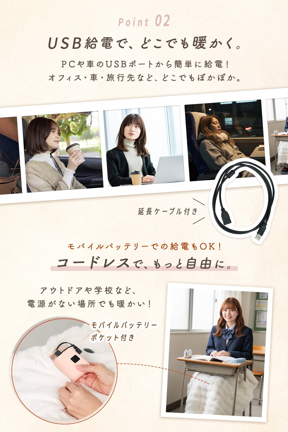 どこでも使えるUSB給電式の電気ブランケットで、冬をもっと快適に。