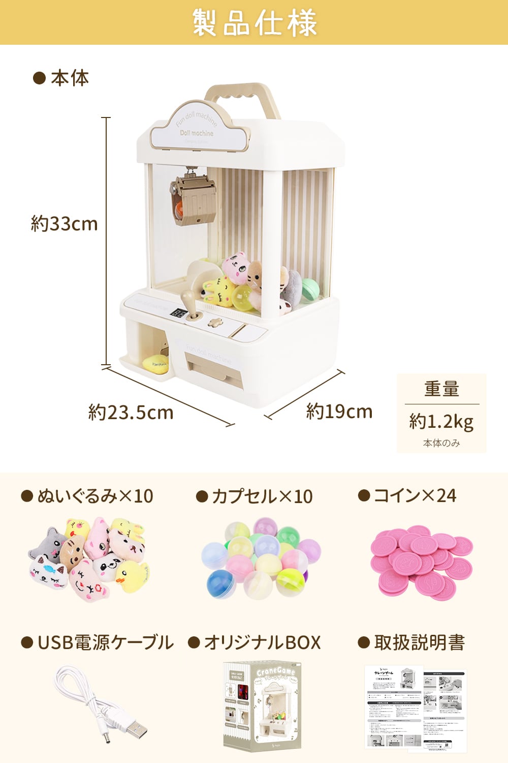 商品内容 本体、USBケーブル、ぬいぐるみ×10、カプセル×10、コイン×24