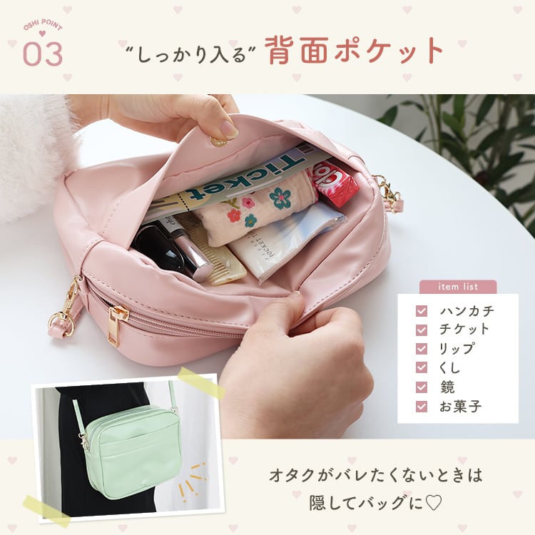 ・スマホやアクスタ、チケットが入れられるポケット付き