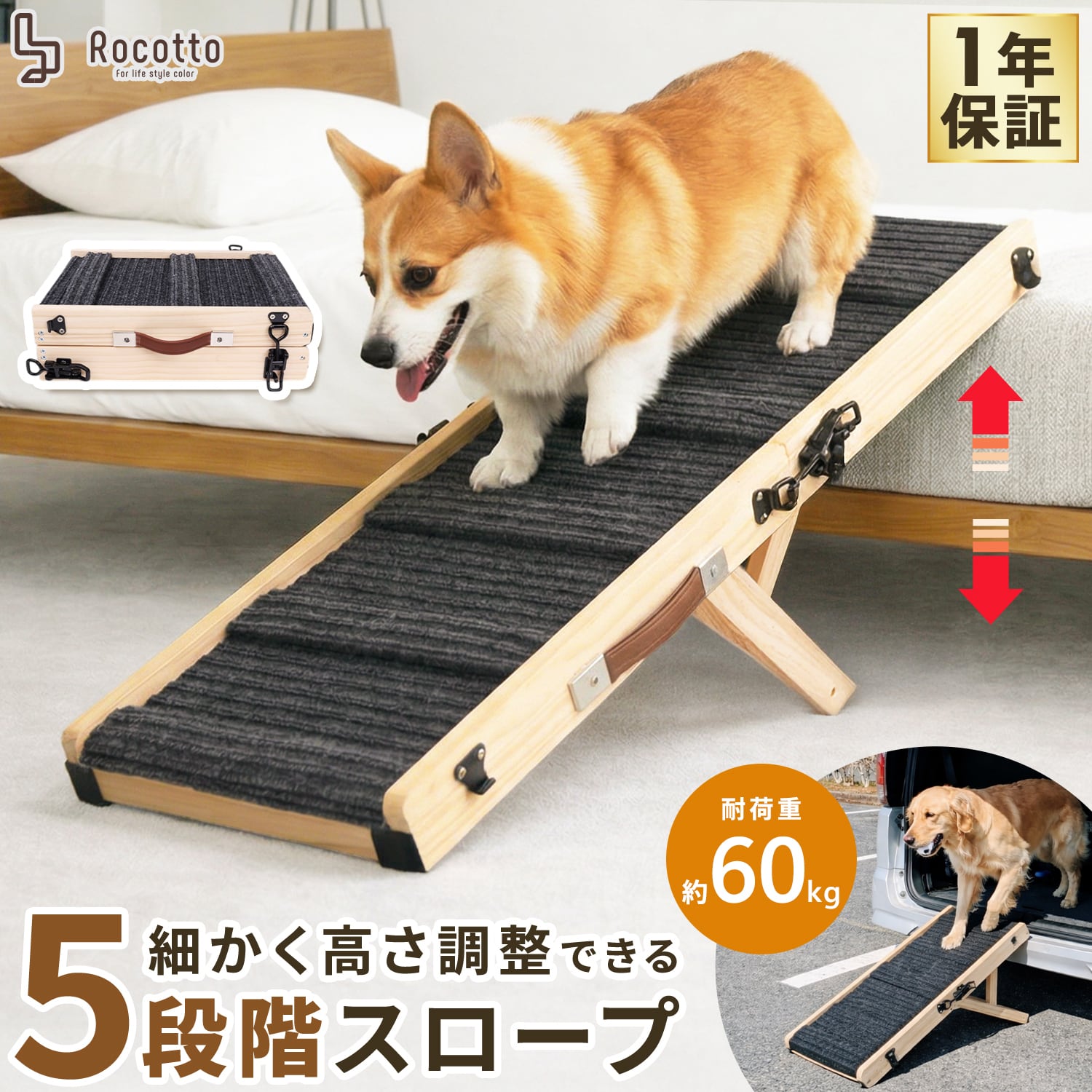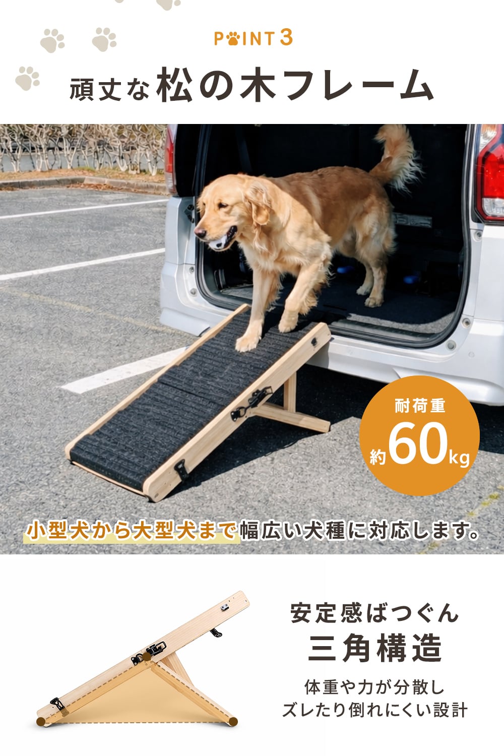 耐荷重は約60kg。小型犬から大型犬まで幅広い犬種に対応します。