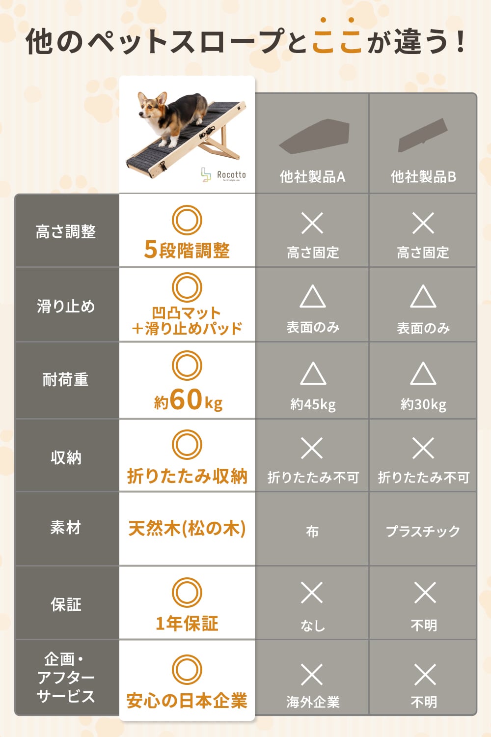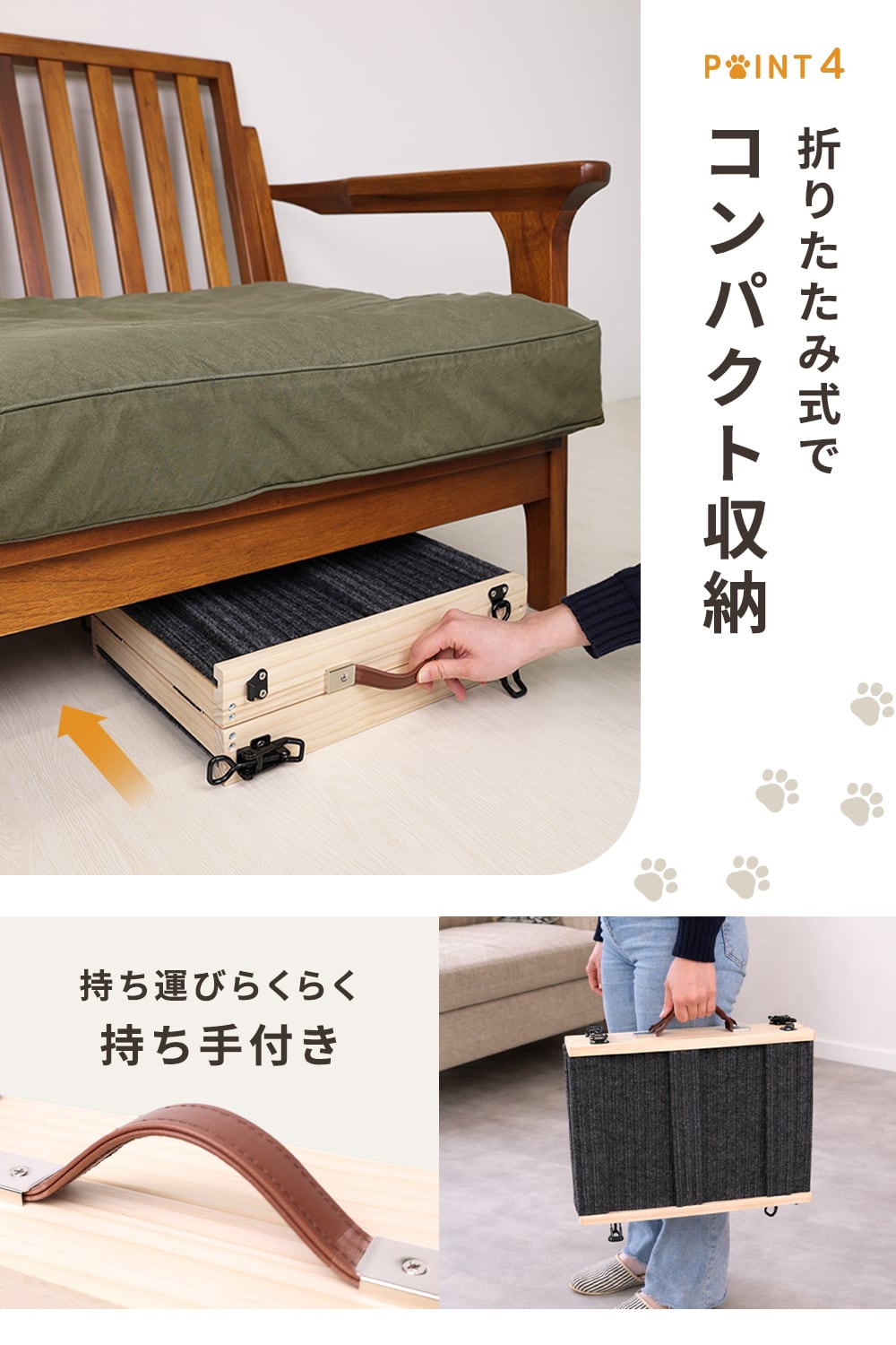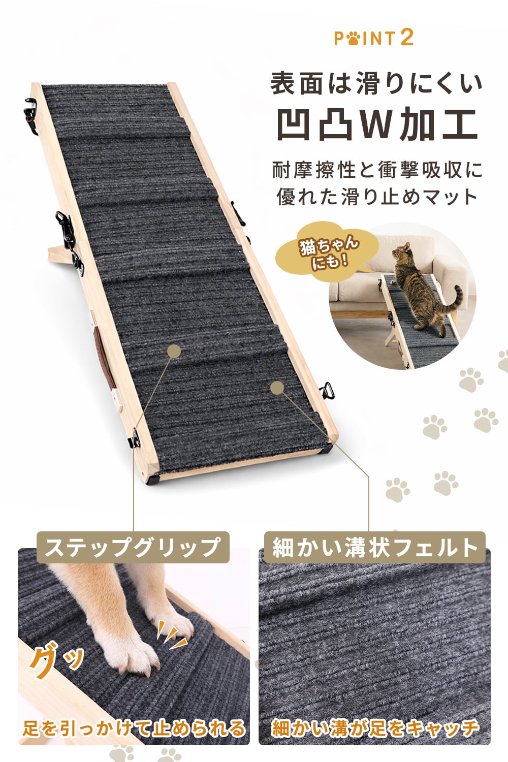 このペットスロープは段差の上り降りをサポートし、愛犬の足腰への負担をやさしく軽減します。
