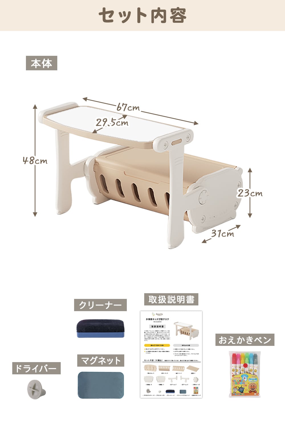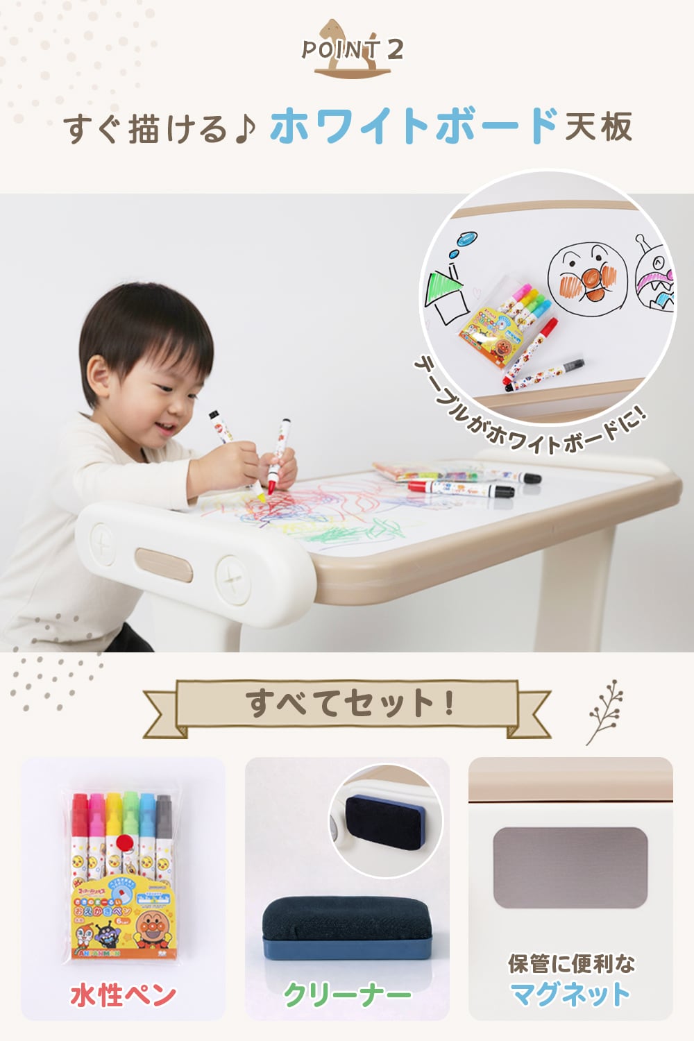 ・書いて消せるホワイトボード天板(アンパンマン水性ペン・クリーナー付き)