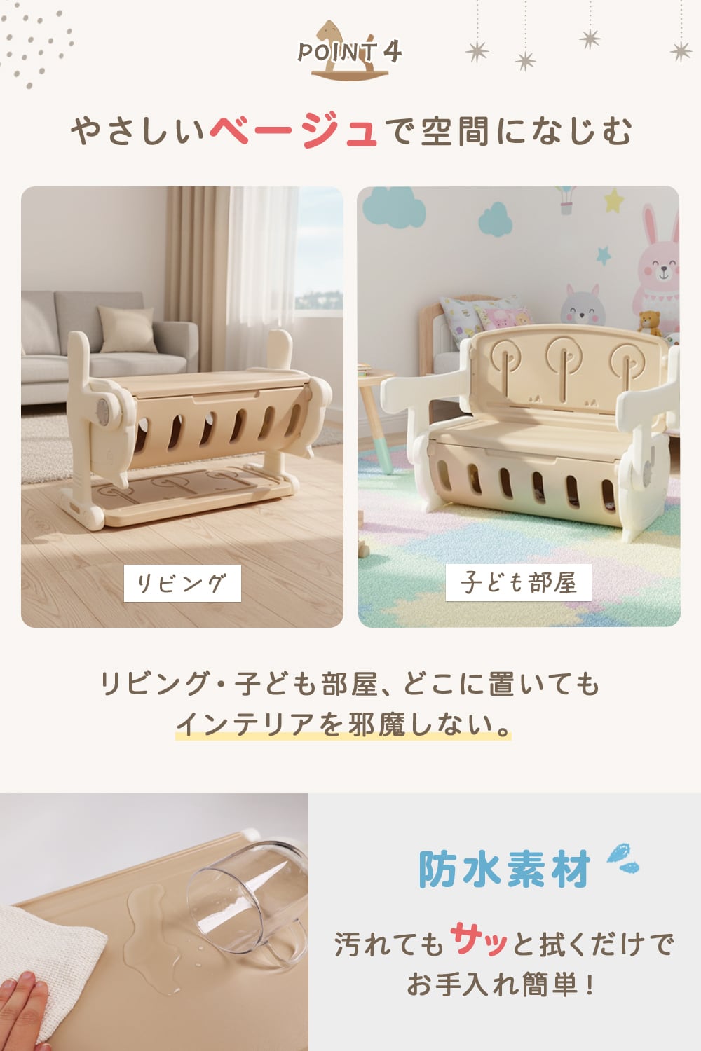 防水素材だから、お手入れもかんたん。