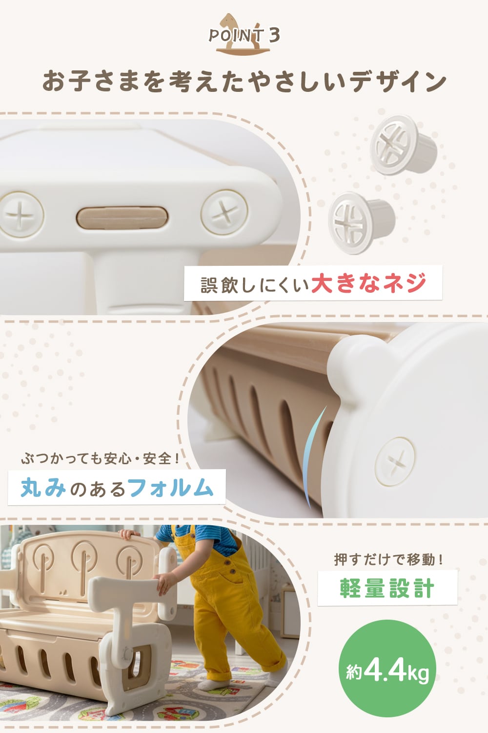 丸みのあるフォルムで、ぶつかっても安心。