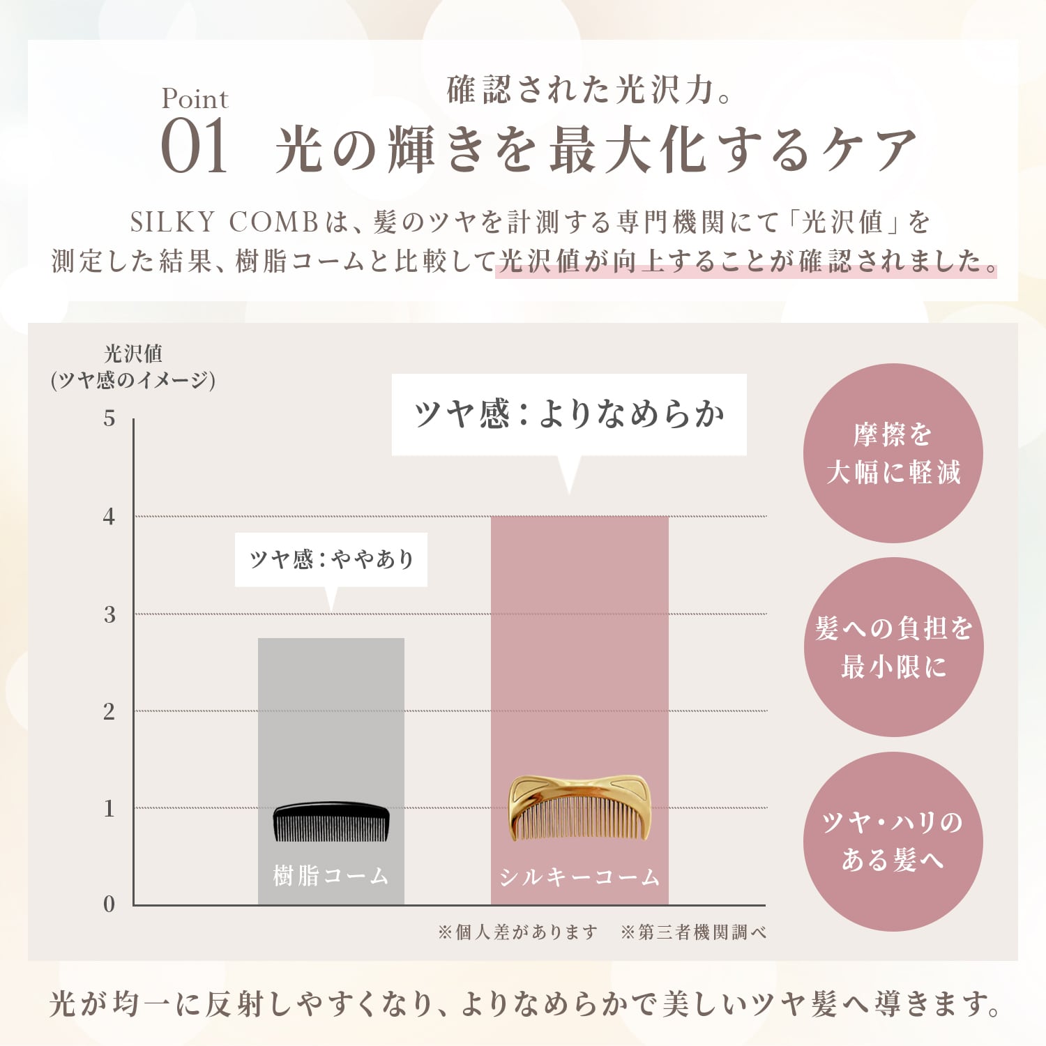 乾燥やカラーで広がりがちな髪も、毎日のブラッシングで自然なツヤをまとった扱いやすい髪へ。