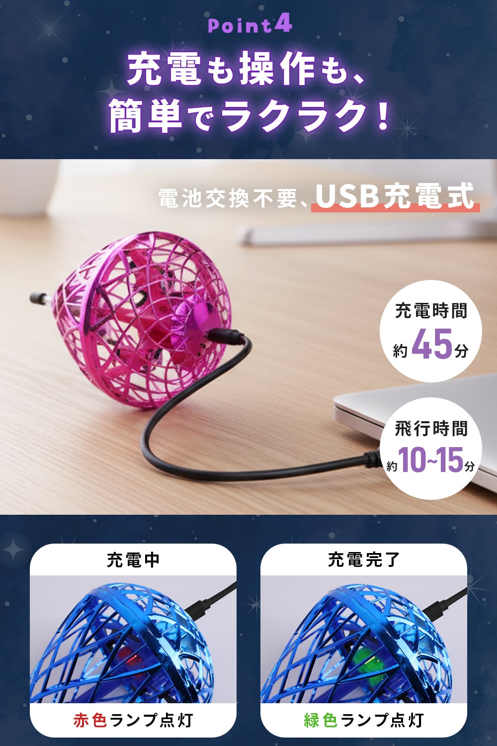 電池不要のUSB充電式で繰り返し遊べる!
