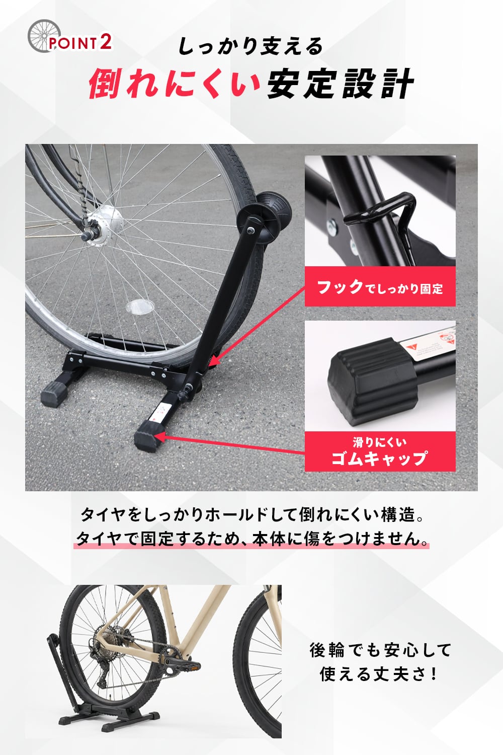 しっかり支える形状で、ぐらつきにくく安定感のある使い心地。毎日の駐輪時も安心して使いやすい設計です。タイヤを支える構造により、見た目以上のしっかり感があります。