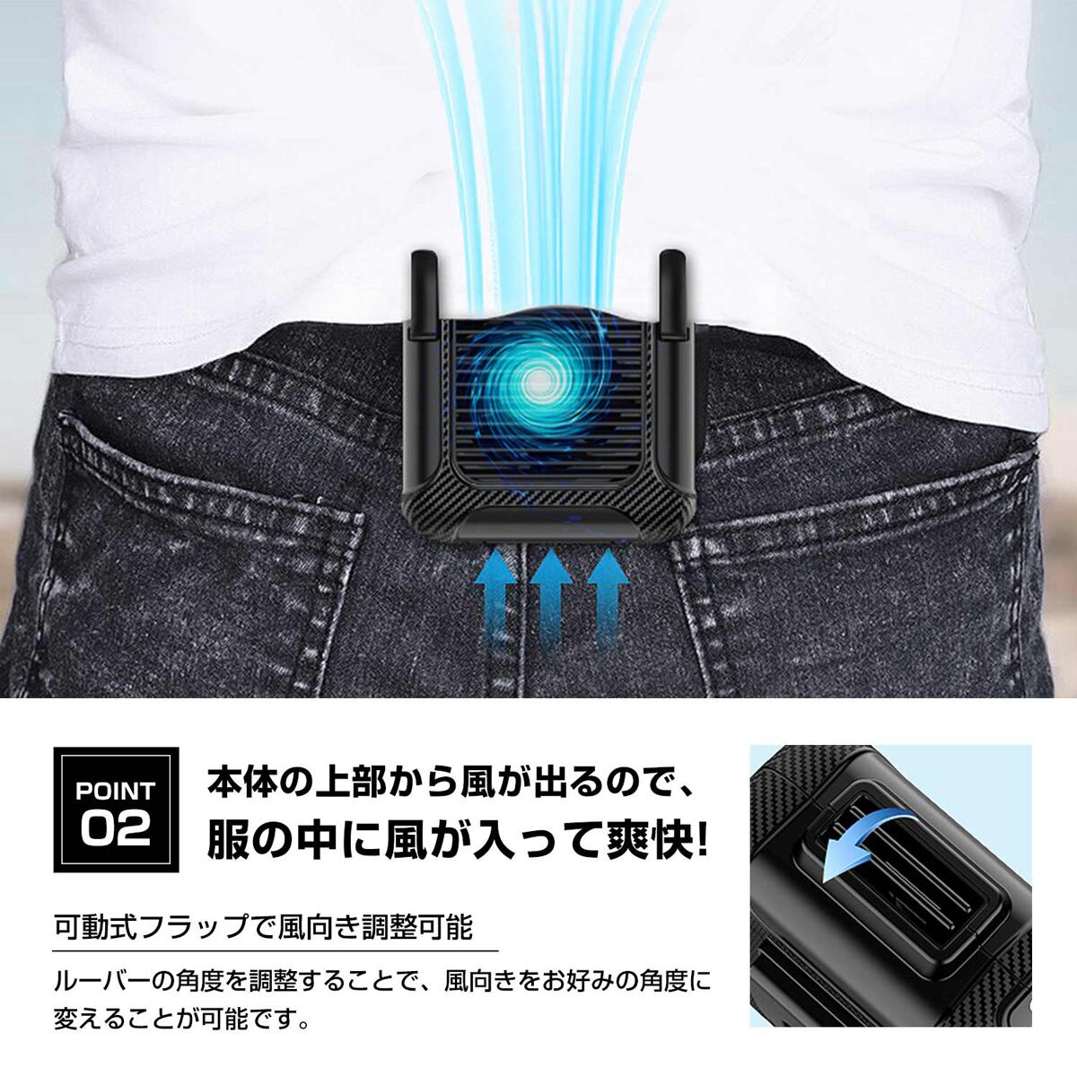 ・本体の上部から風が出るので、服の中に風が入って爽快!