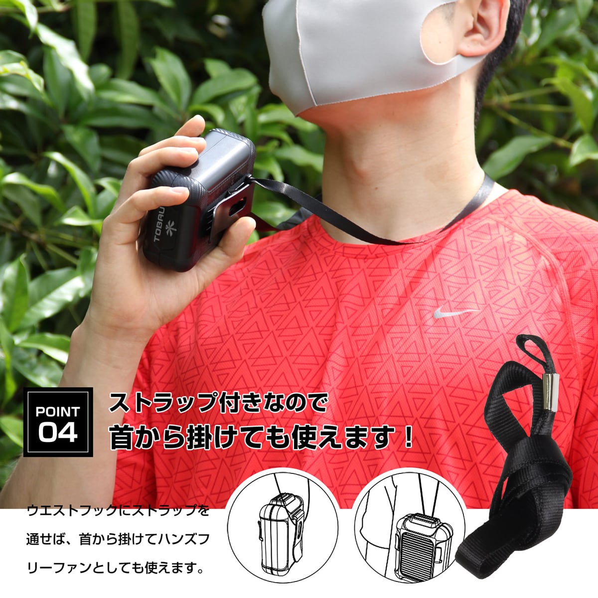 ウエストフックにストラップを通せば、首から掛けてハンズフリーファンとしても使えます。