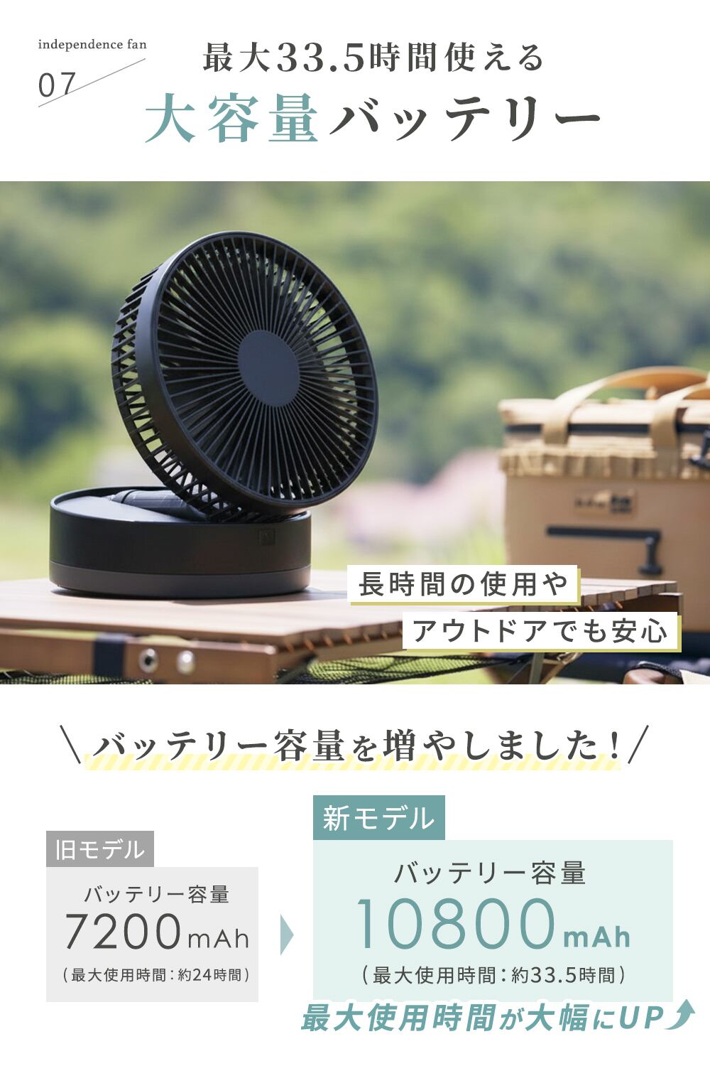 コンセントがない場所でも使えるので、アウトドアや車中泊にも便利です。