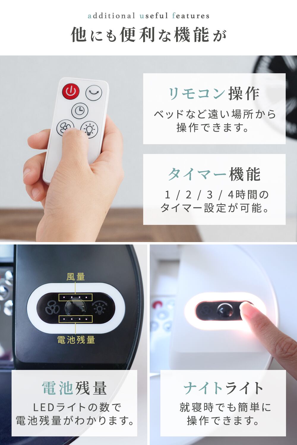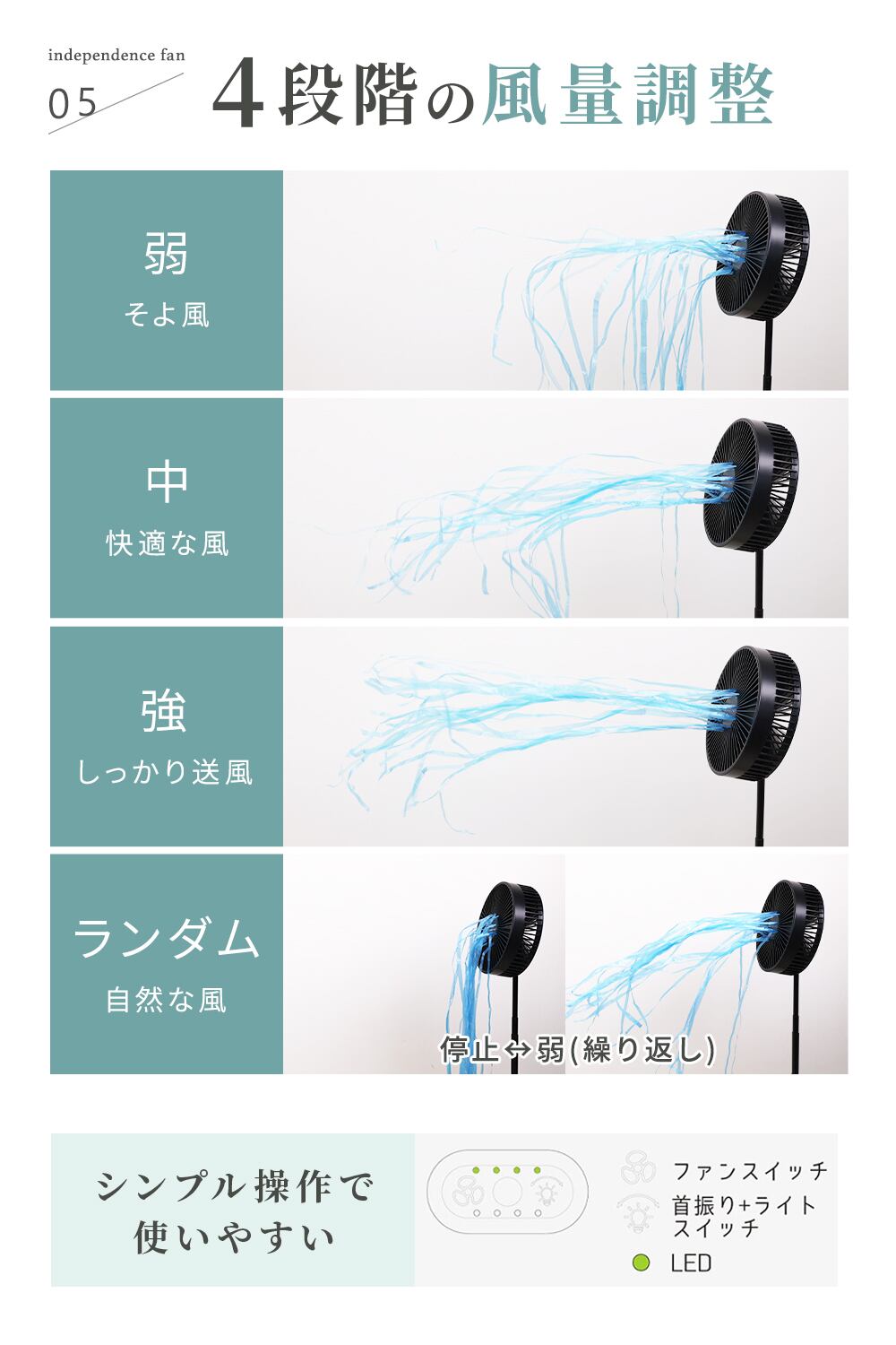 弱・中・強・ランダムの4段階で風量調整。