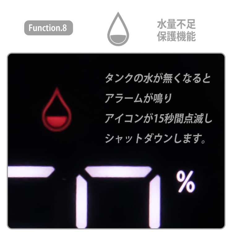 タンクの水が無くなるとアラームが鳴りアイコンが15秒間点滅しシャットダウンします。