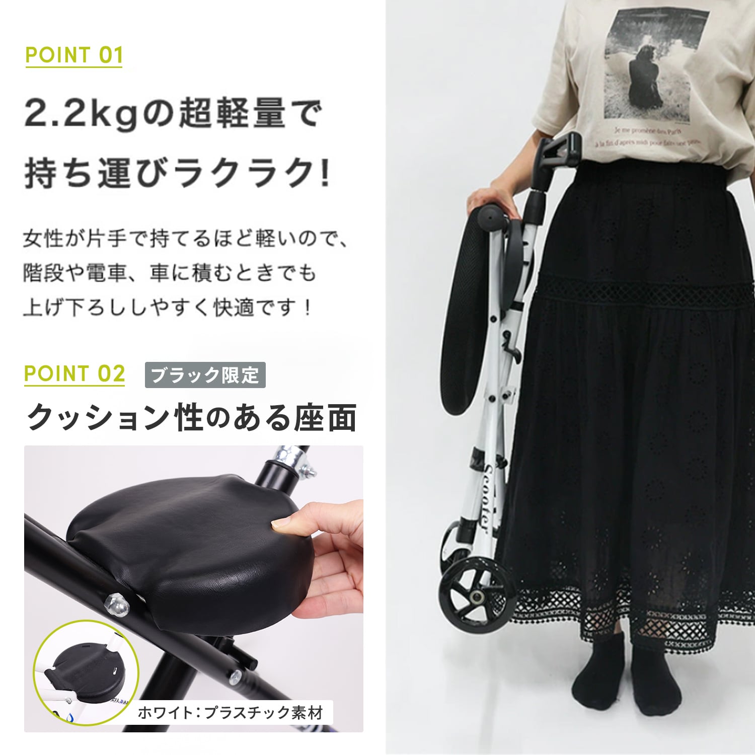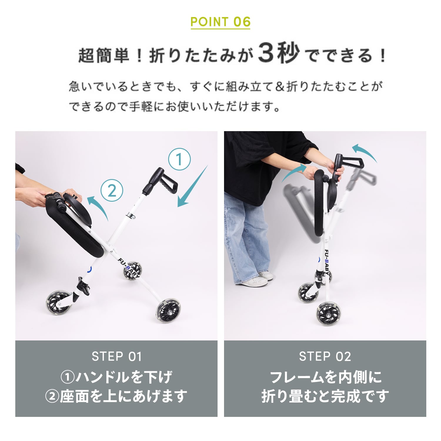 女性が片手で持てるほど軽いので階段や電車、車に積むときでも上げ下ろししやすく快適です!3秒で折りたためるので、急いでいるときや短距離でも手軽にお使いいただけます。