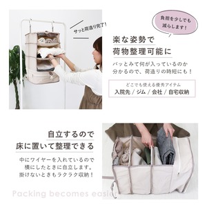 取り出したアコーディオン型ポーチは、クローゼットのハンガーポールに引っかけるだけで棚の様になり、滞在先旅行先での荷物整理がラクラク!というか不要になります。