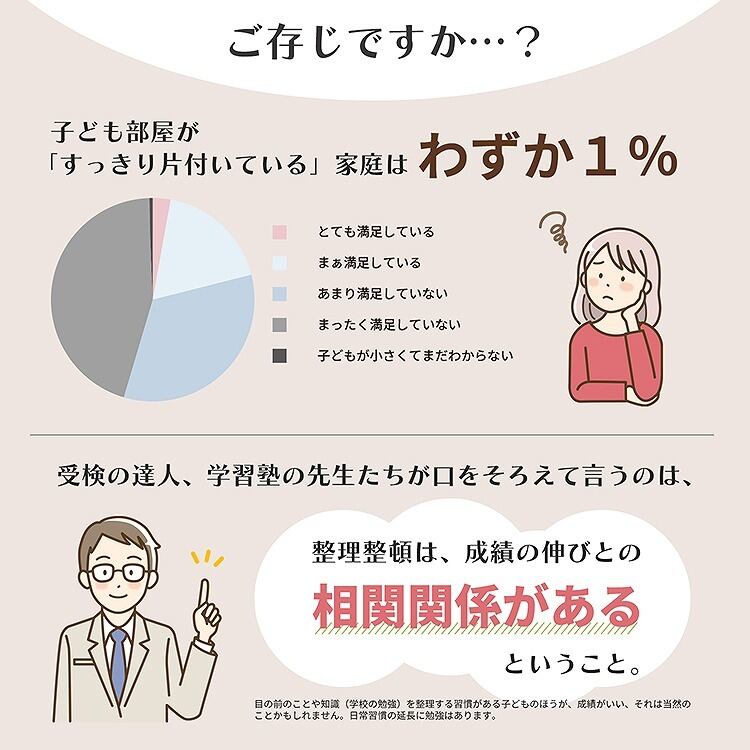 お子さまの学習効率を上げるには、各データベースにみられるように勉強スペースの整理整頓が必須です。