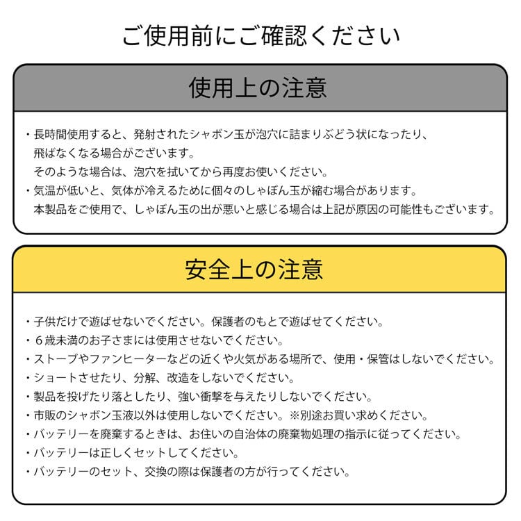 本製品をご使用で、しゃぼん玉の出が悪いと感じる場合は上記が原因の可能性もございます。