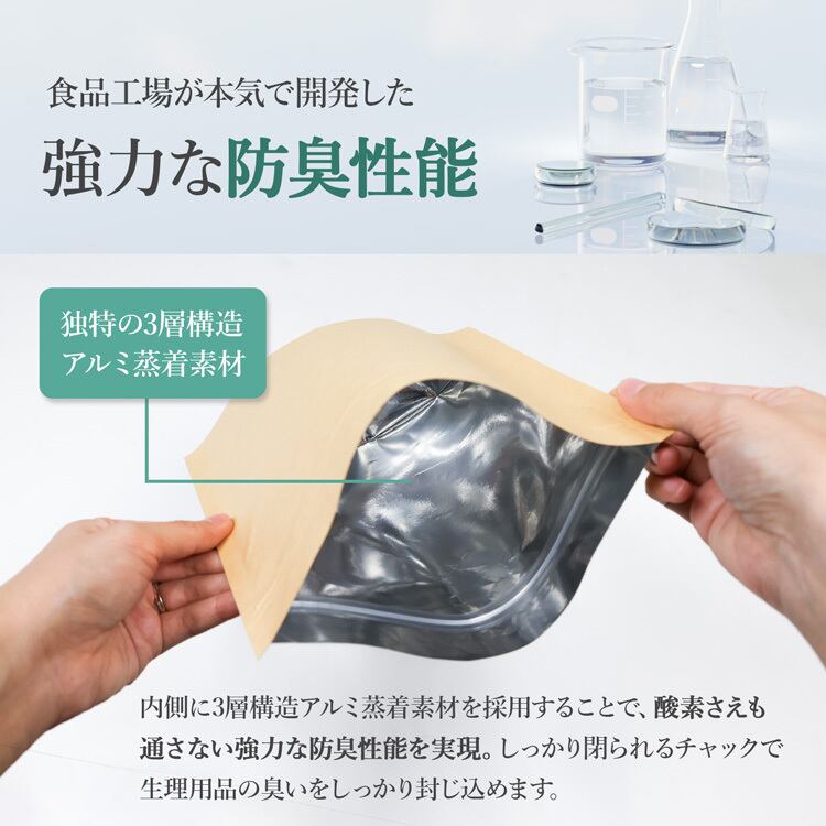 強力な防臭性能:独特の3層構造アルミ蒸着素材とチャック付き設計により、生理用品の臭いをしっかり封じ込めます。