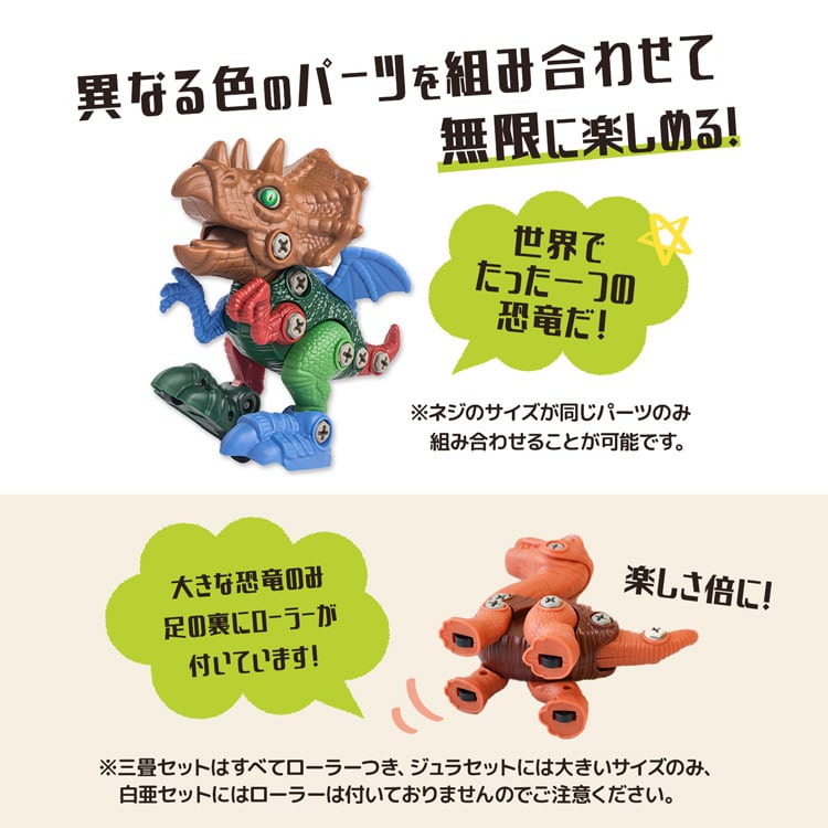 仕様 収納箱に恐竜のパーツを入れた状態でのお届けです。 恐竜ごとに色、大きさ、ネジのサイズ、足のローラーの有無が異なります。