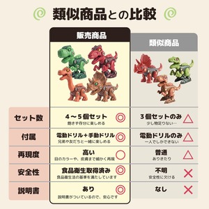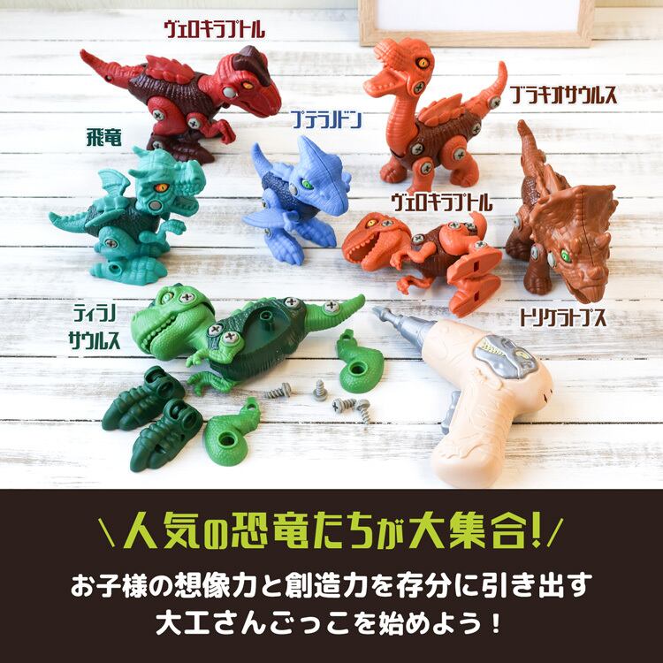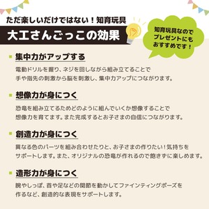 恐竜の魅力と大工さんごっこ遊びを合わせたこの商品は、組み立てや、分解したりする作業が、手の力の調整や手の動きを制御する能力の向上に繋がり、知育玩具として幅広い年齢のお子様にお楽しみいただけます。