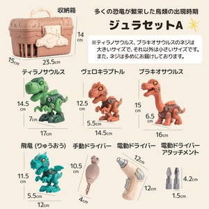 仕様 収納箱に恐竜のパーツを入れた状態でのお届けです。 恐竜ごとに色、大きさ、ネジのサイズ、足のローラーの有無が異なります。
