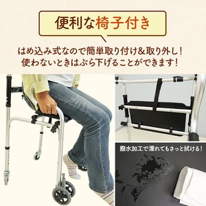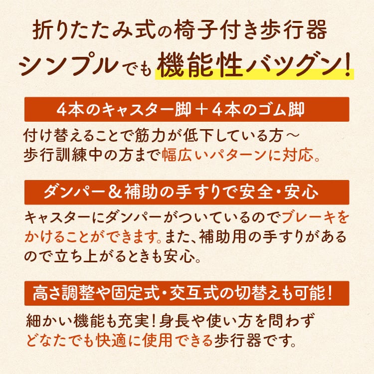 さらに固定式歩行器と交互式歩行器の交互式、2way仕様なので、状況に応じた使い分けができ、疲れた時等にお座りいただける座面付き!休憩が必要な時にも便利です。