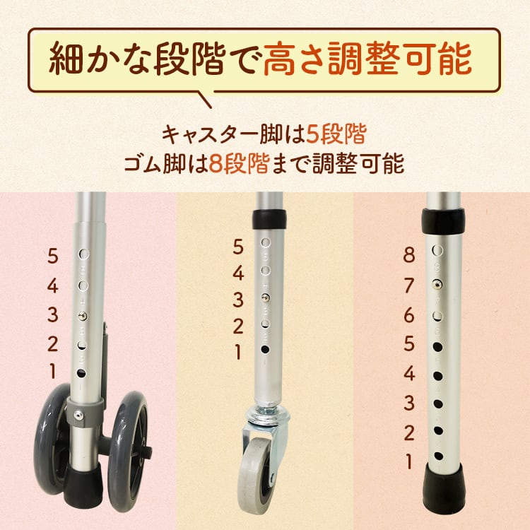 この歩行器はご使用者様の状態により使い分けられるキャスター脚は5段階