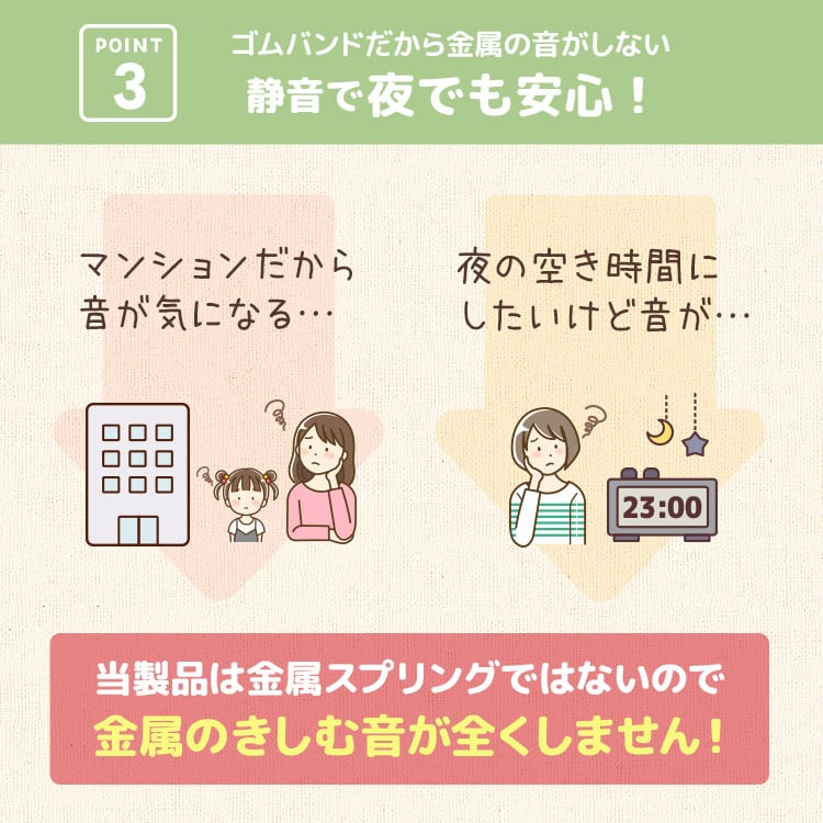 金属製のスプリングではバネの軋む音が大きく、騒音の問題からマンションや夜間に使うと近所迷惑になりかねません。
